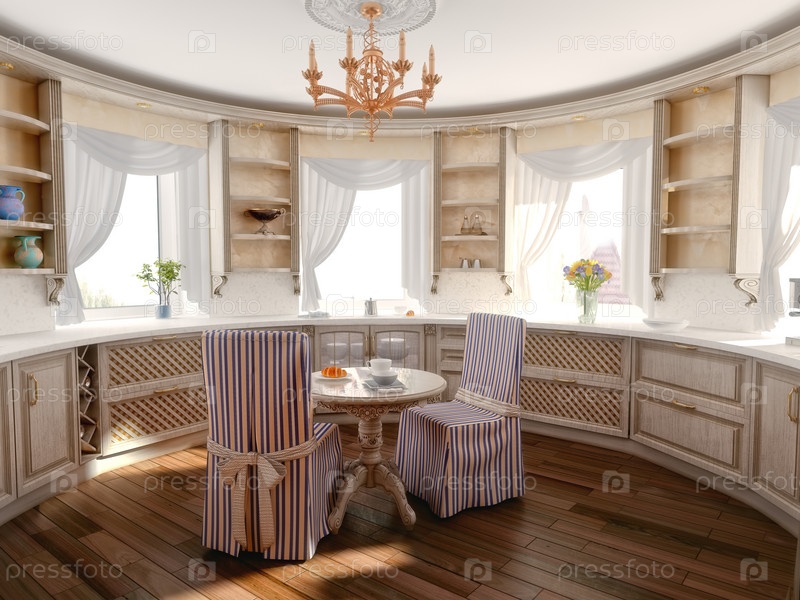 Роскошный интерьер кухни в классическом стиле (3D визуализация)