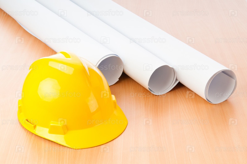 Чертежи и строительная каска на столе