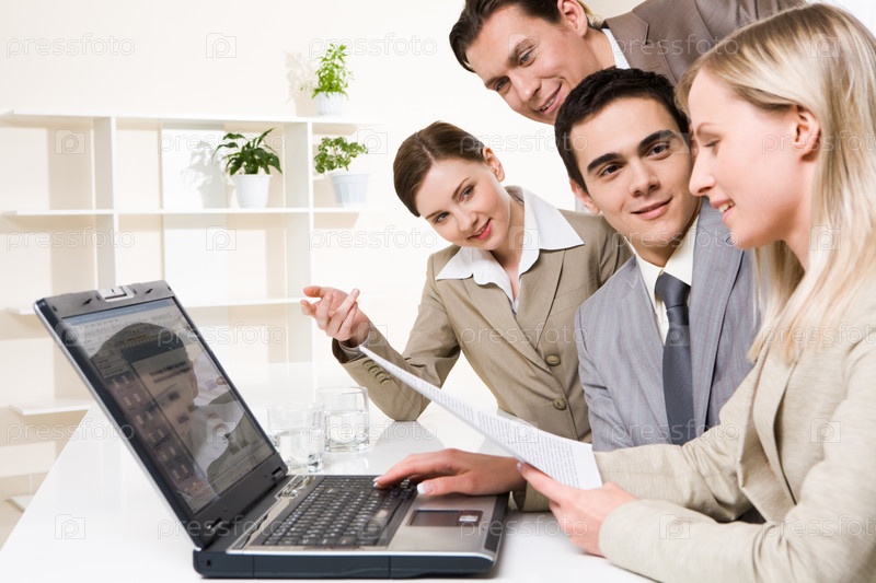 Портрет дружеской рабочей команды, смотрящей на уверенную в себе деловую женщину с документом в руке и печатающей на ноутбуке