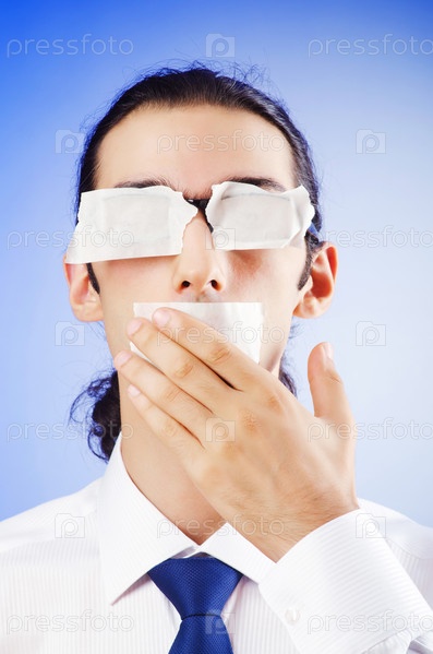 Бизнесмен с заклеенными глазами и ртом