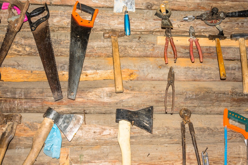 Инструменты на бревенчатой стене