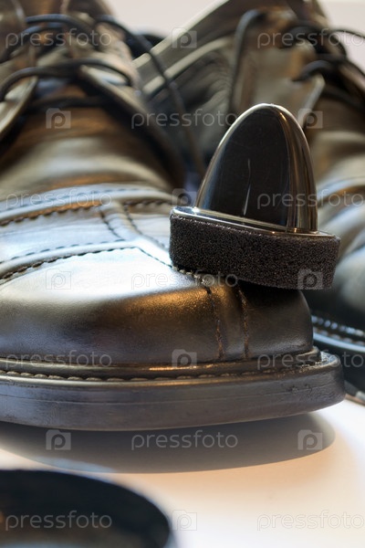 Ботинки и губка для обуви на белом фоне