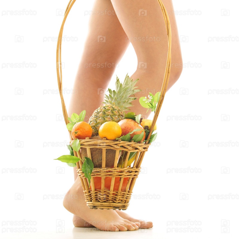 Женские ноги и корзина со свежими тропическими фруктами