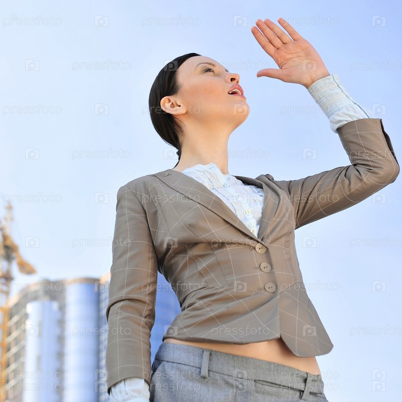 Портрет молодой красивой бизнес-леди на фоне неба и здания