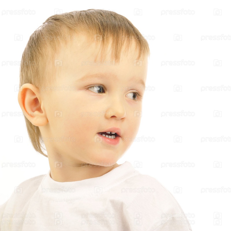 Счастливый мальчик смотрит в сторону, на белом фоне