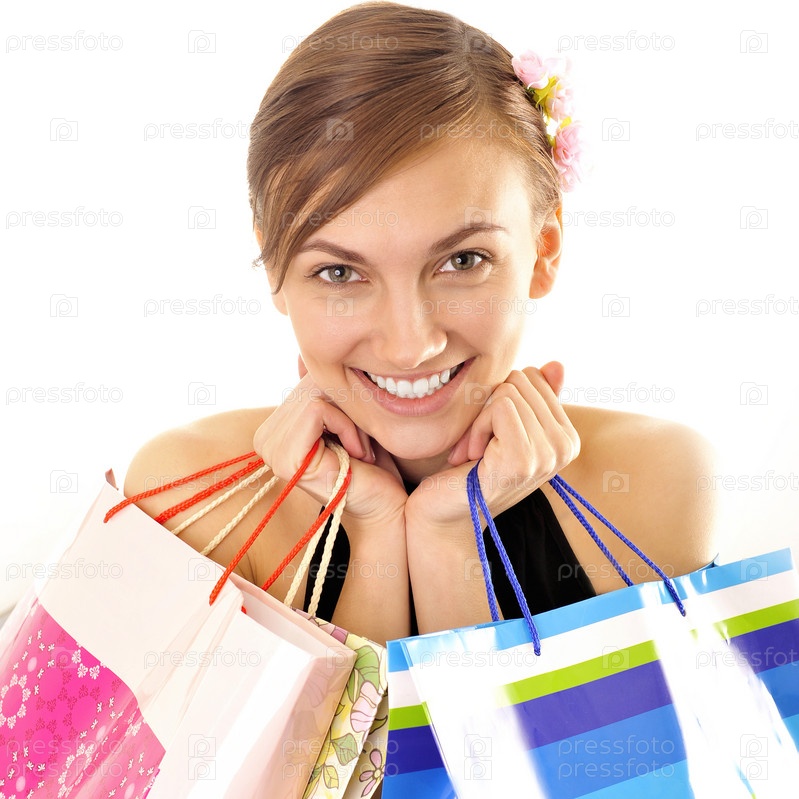 Молодая счастливая женщина с пакетами на белом фоне