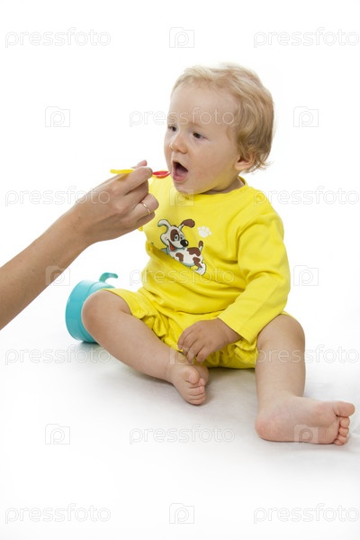 Мама кормит маленького сына на белом фоне