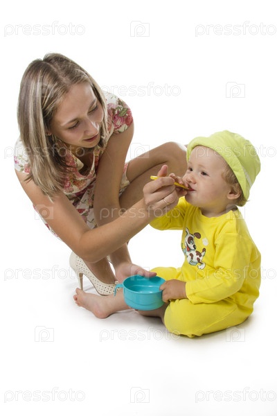 Мама кормит маленького сына на белом фоне