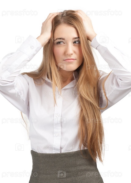 Портрет деловой женщины с головной болью, на белом фоне