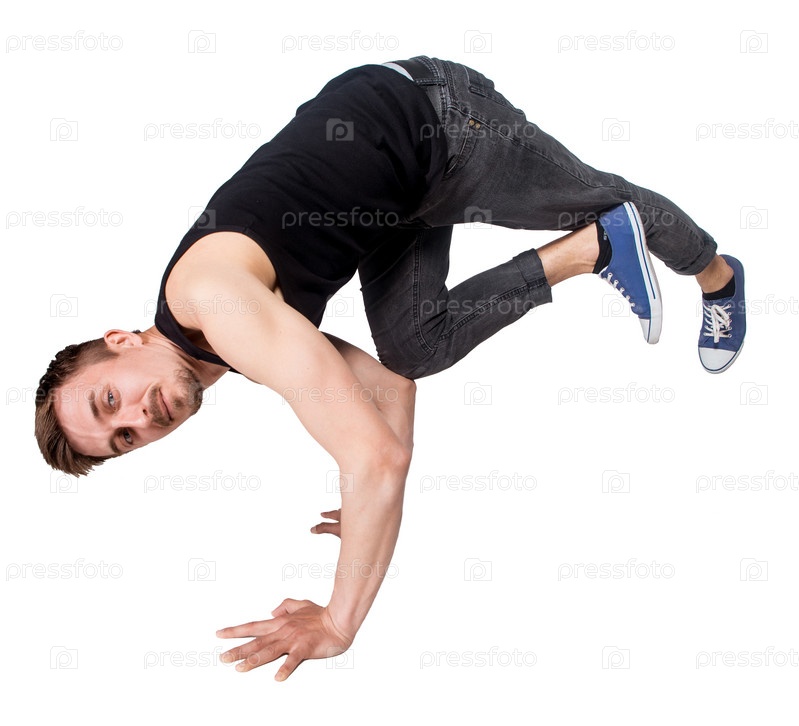 Брейк-дансер делает стойку на белом фоне