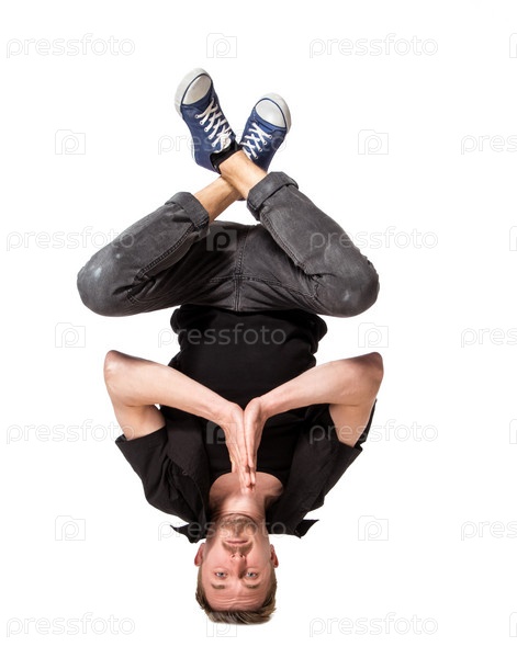 Брейк-дансер делает стойку на голове на белом фоне