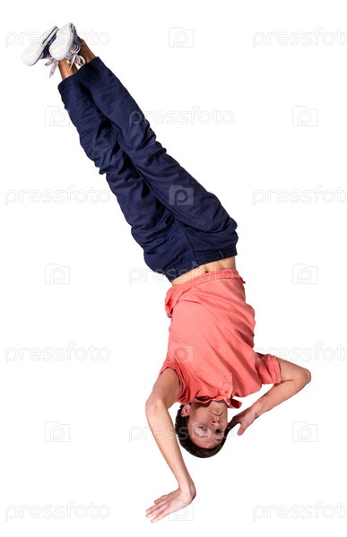 Брейк-дансер делает стойку на белом фоне