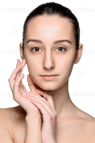 Портрет красивой девушки, которая показывает, что у нее здоровая кожа