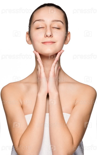 Портрет красивой девушки, которая гладит свое лицо со здоровой кожей
