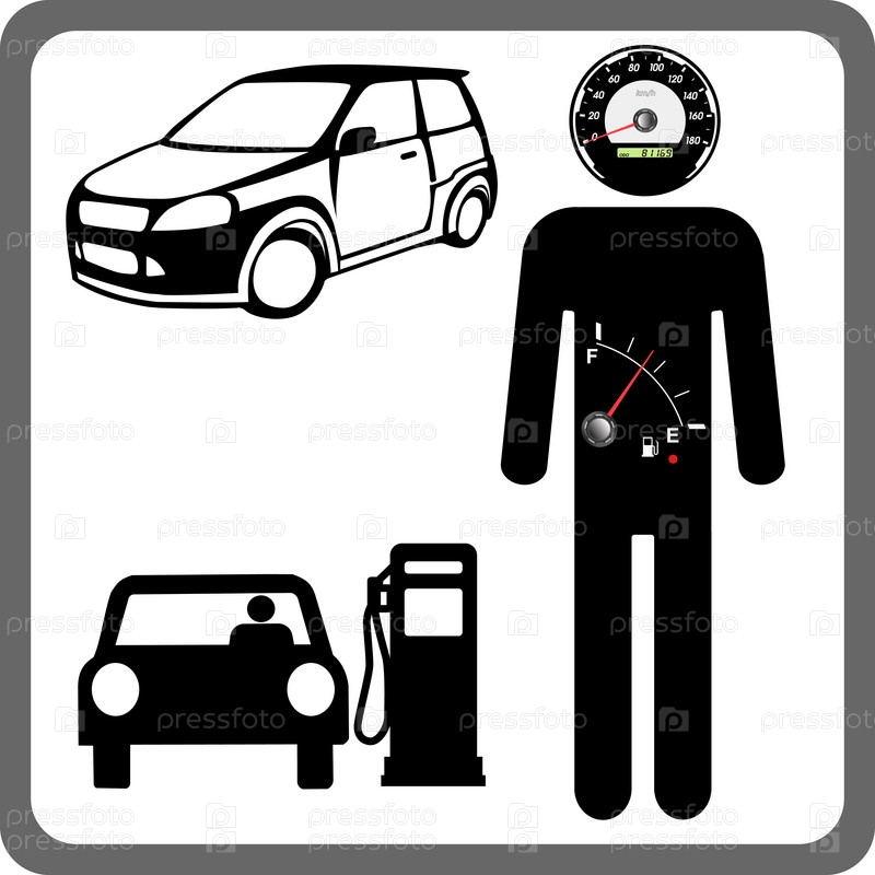Силуэт человека со спидометром вместо головы и указателем уровня топлива, автомобиль и бензоколонка, векторная иконка