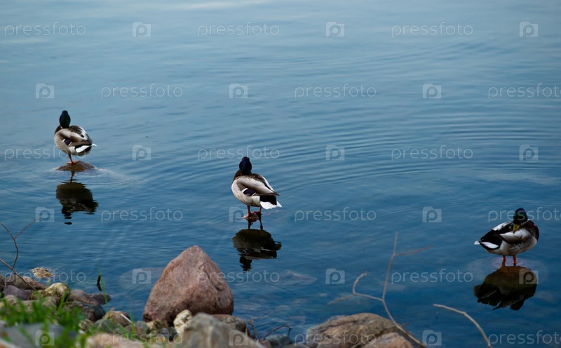 Три утки стоят в воде у берега