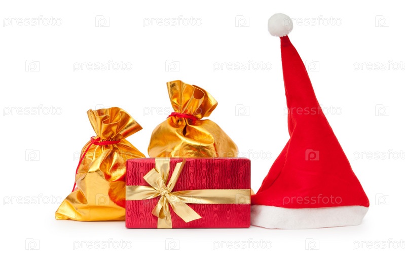 Подарочная коробка, мешки и колпак Санта-Клауса на белом фоне