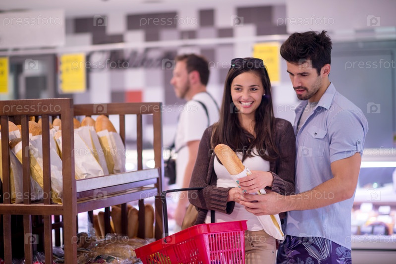 Молодая пара делает покупки в супермаркете