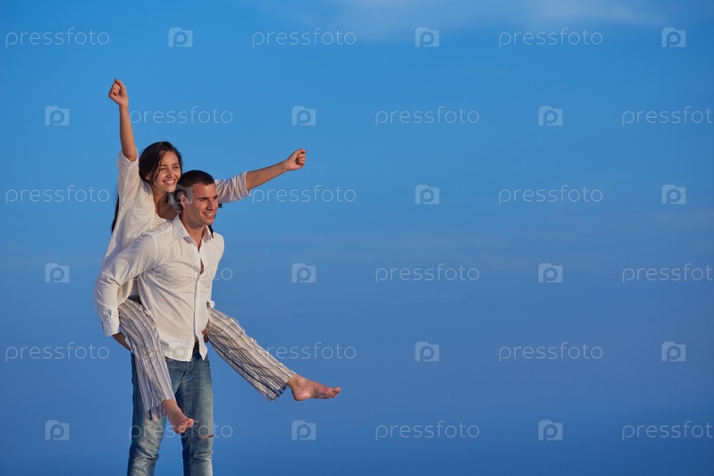 Счастливая молодая романтическая пара весело отдыхает дома на под=бережье