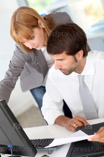 Бизнес-Группа в офисе работает на настольном компьютере