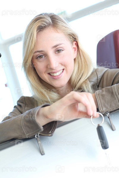 Улыбающиеся женщина держит новый ключ автомобиля