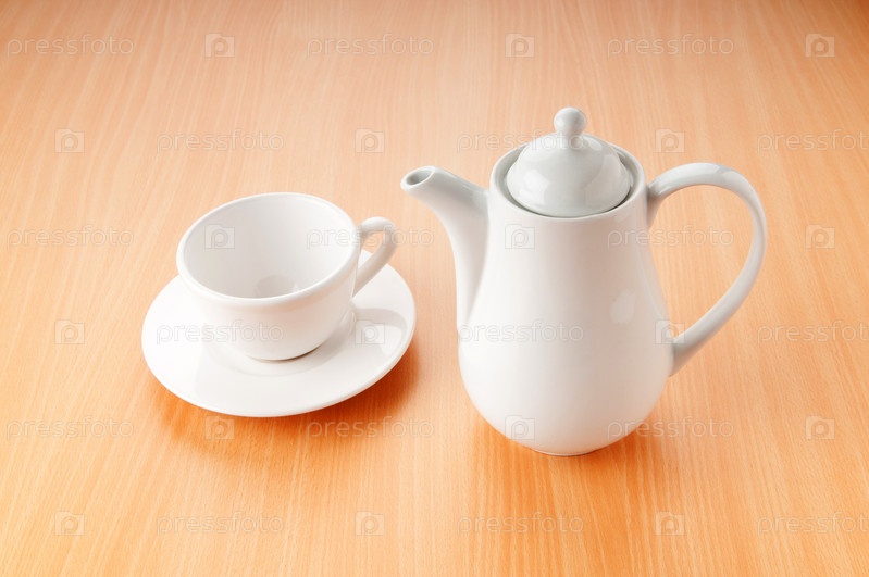 Чайник и чашка с блюдцем на столе