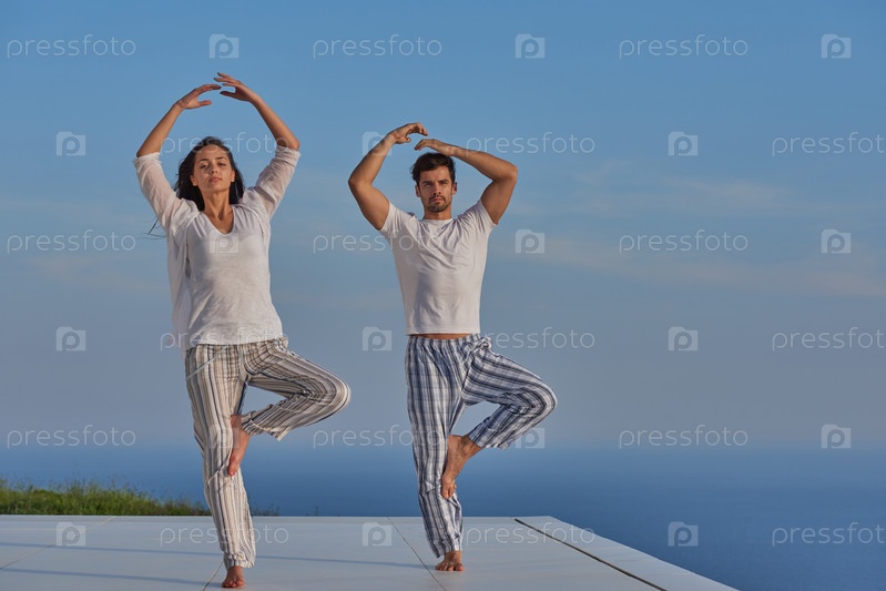 Молодая пара занимается йогой