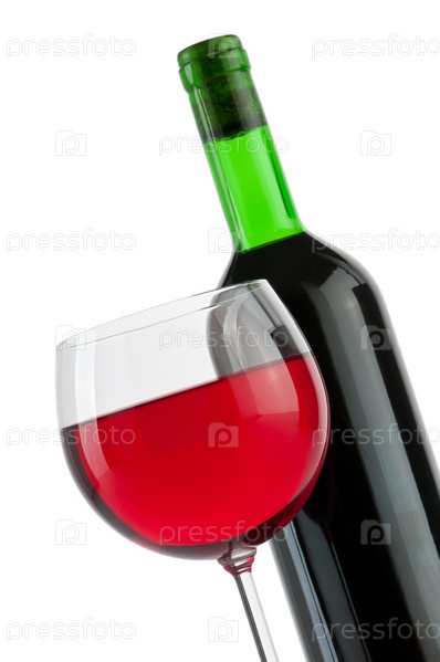 Бокал и бутылка вина на белом фоне