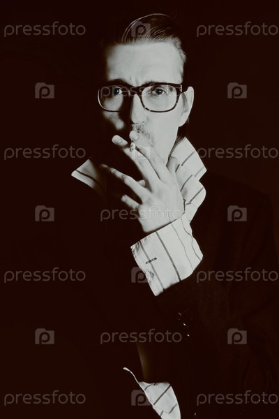 Человек в очках с сигаретой на черном фоне