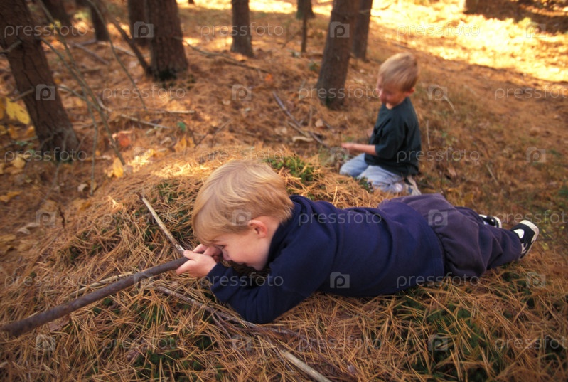 Два мальчика играют в лесу