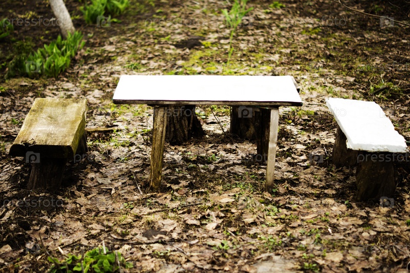 Скамейки в лесу. Для коммерческих и редакционных использования