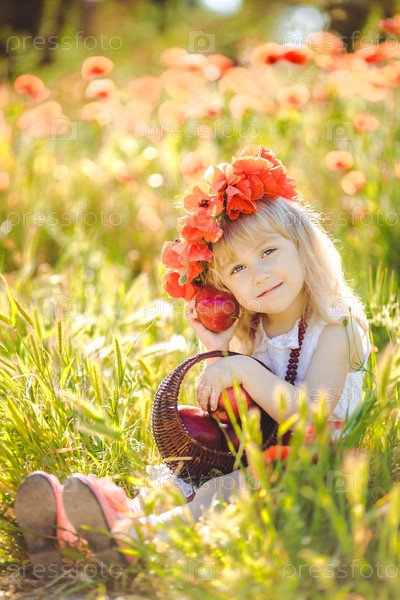 Девочка со светлыми волосами в поле в венке из маков