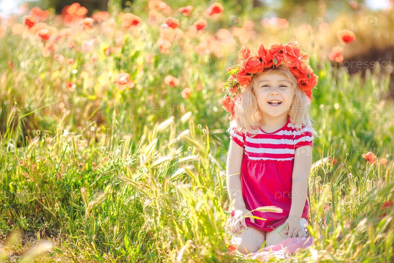 Девочка со светлыми волосами в поле в венке из маков