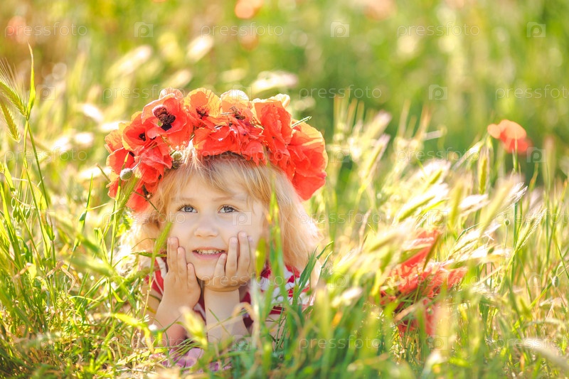 Девочка со светлыми волосами в поле в венке из маков