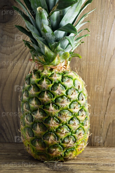 Спелый ананас вкусно лежат на фоне деревянные