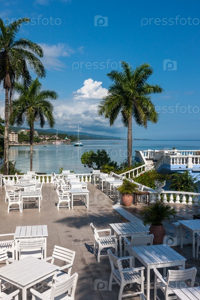 Белые столы и стулья в тропическом саду на пляже