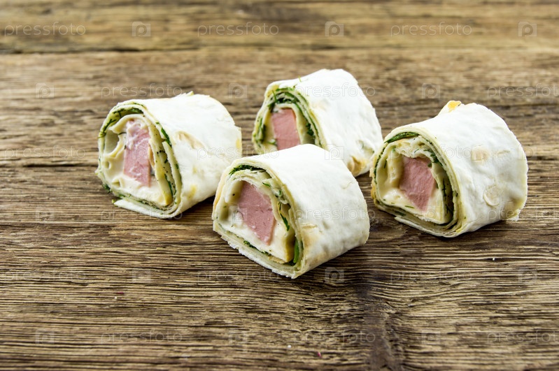 Лаваш рулоны лежат на фоне деревянные