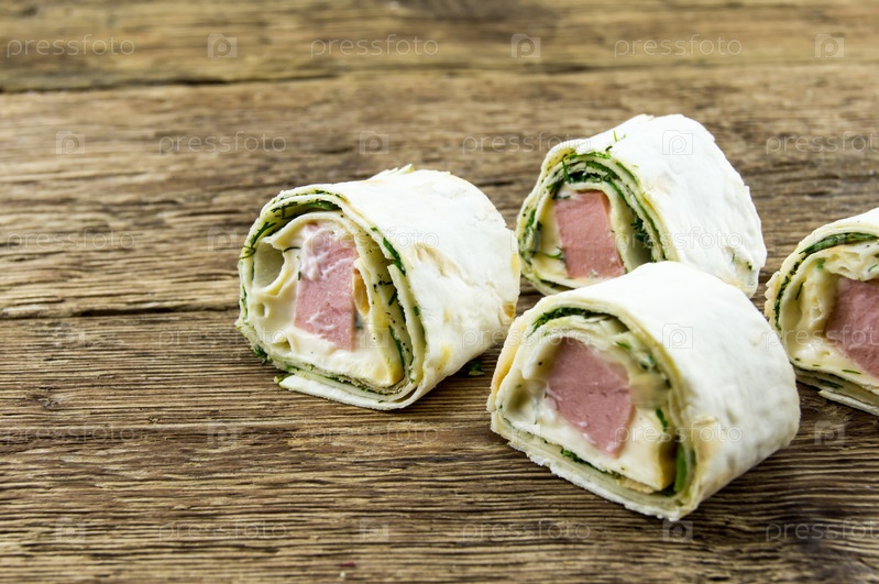 Лаваш рулоны лежат на фоне деревянные