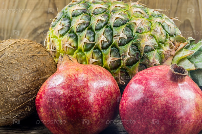 Экзотические фрукты лежат на фоне деревянные