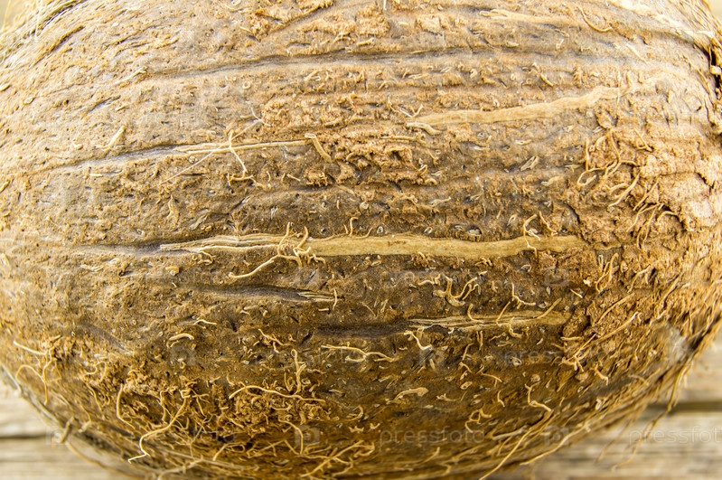 Кокос и лежат на фоне деревянные