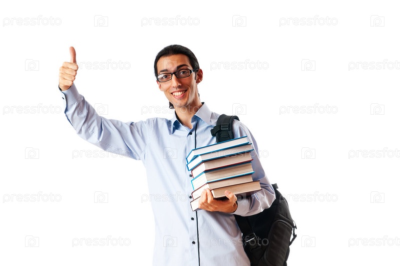 Студент со стопкой учебников показывает одобрительный жест