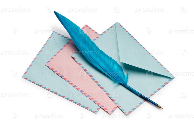 Перо с конвертами на белом фоне