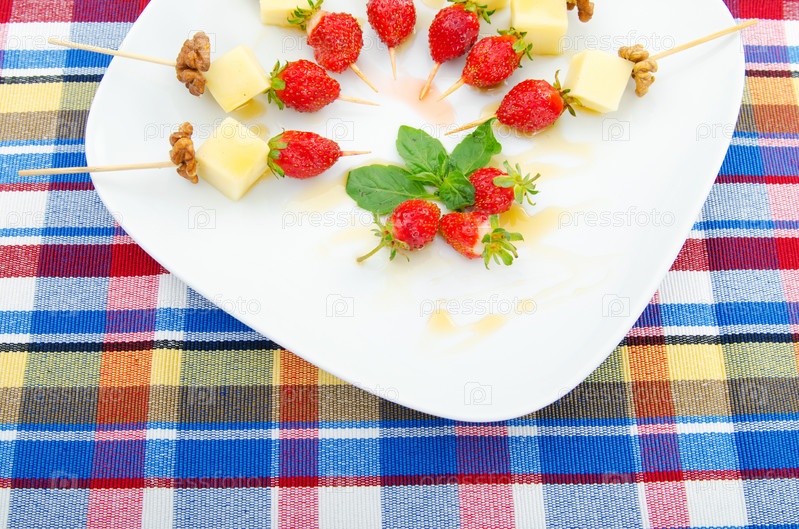 Фруктовый десерт с клубникой на тарелке