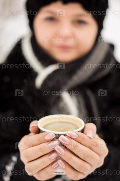 Женщина с чашкой кофе в зимнем парке