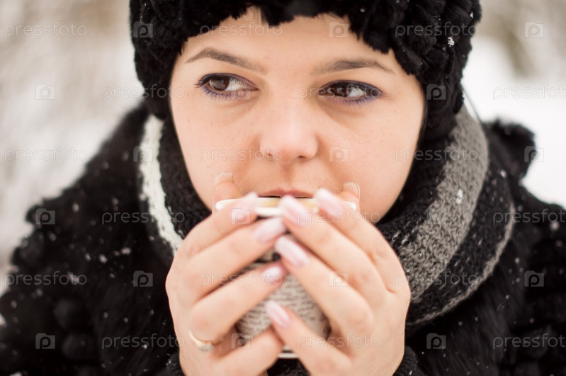 Женщина с чашкой кофе в зимнем парке