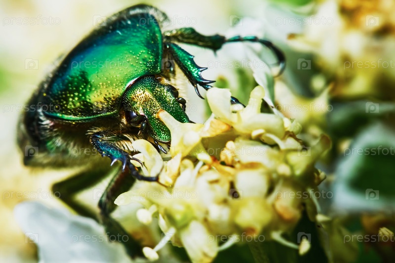 Зеленый майский жук на цветущем дереве