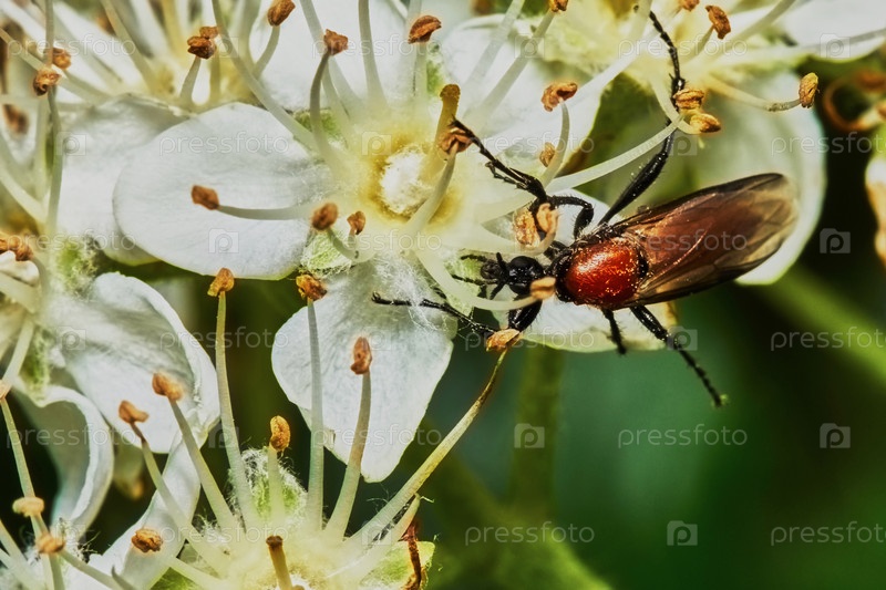 Жук на цветущей рябине в саду