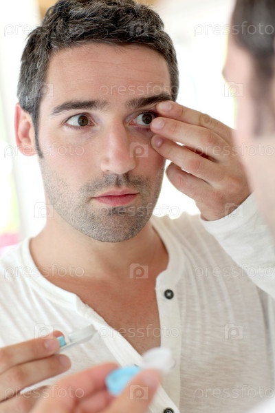 Мужчина одевает контактные линзы