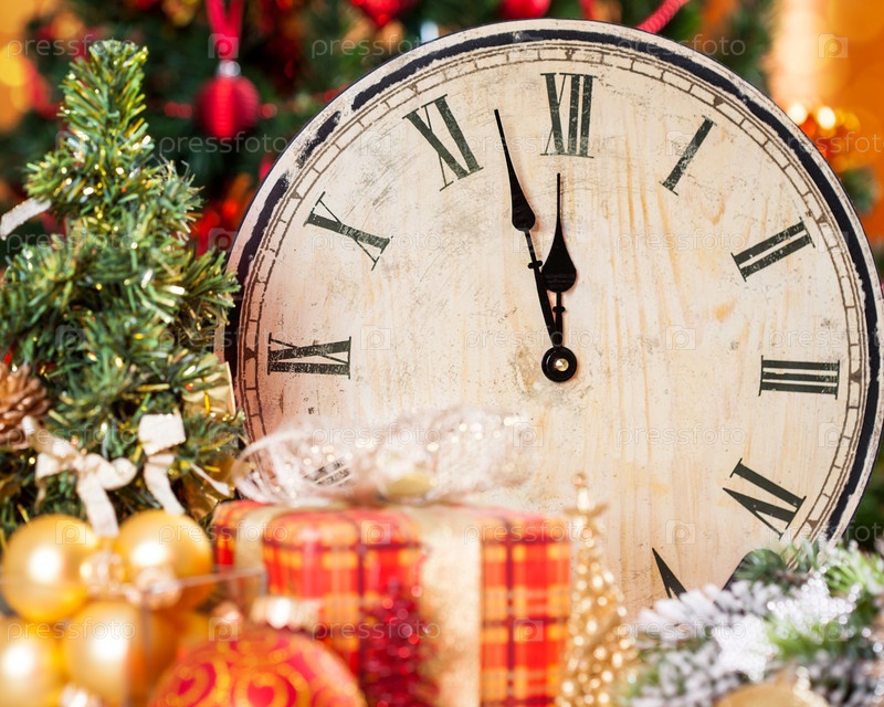 Старинные деревянные часы и рождественские украшения