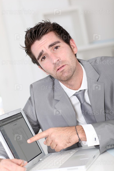 Бизнесмен что-то показывает на экране ноутбука